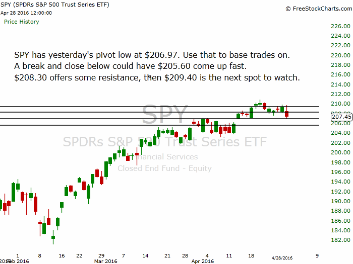 SPY has yesterday's pivot low at $206.97. Use that to base trades on. A break and close below could have $205.60 come up fast. $208.30 offers some resistance, then $209.40 is the next spot to watch.