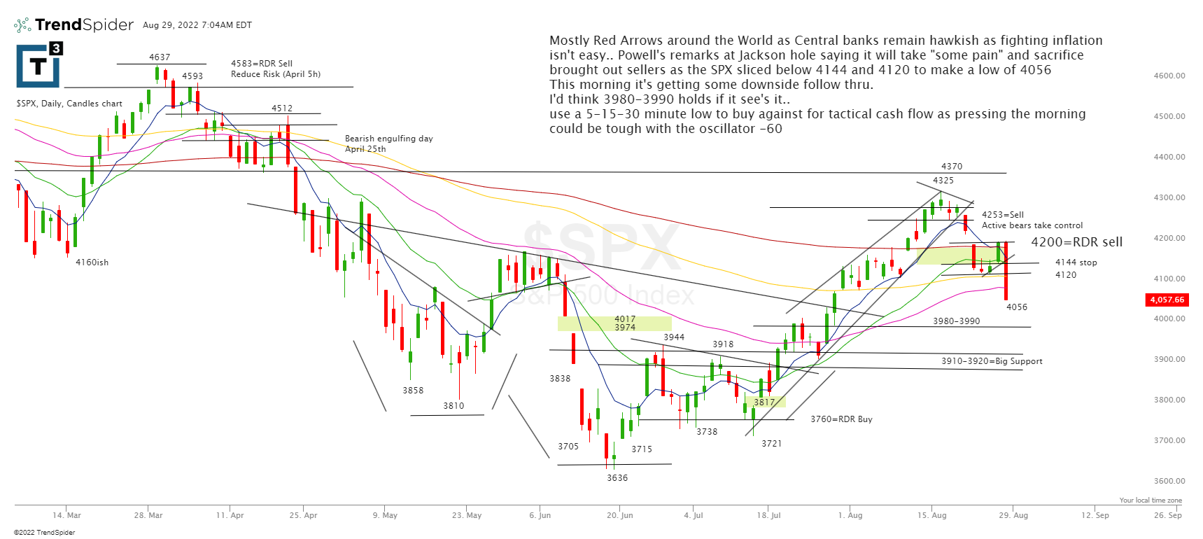 We have mostly red arrows around the world as central banks remain hawkish in a tough fight against inflation. Powell's remarks at Jackson hole saying it will take some pain and sacrifice brought out sellers. The SPX sliced below 4144 and 4120 to make a low of 4056.