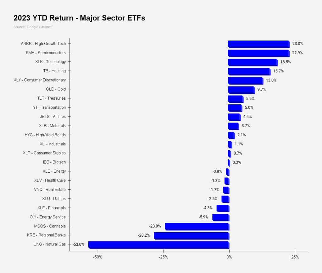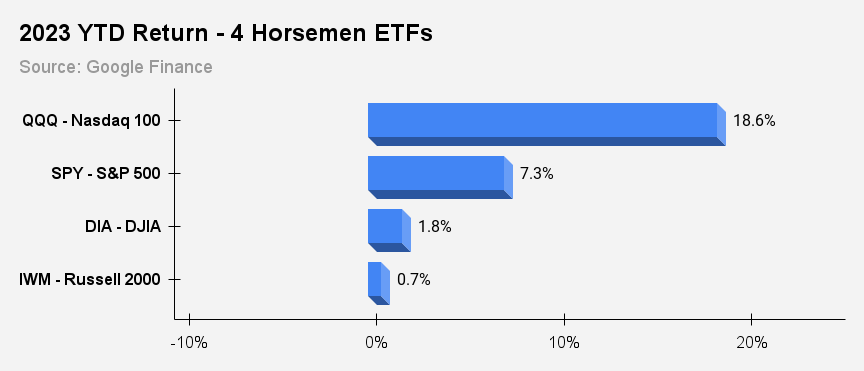 Tech is outperforming big time in 2023, with the QQQ's up 18.6% vs. a 7.3% gain for SPY: