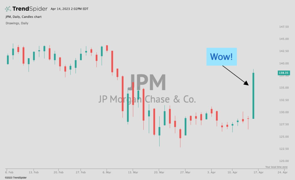 Bank earnings were on the strong side Friday, with JP Morgan (JPM) surging higher: