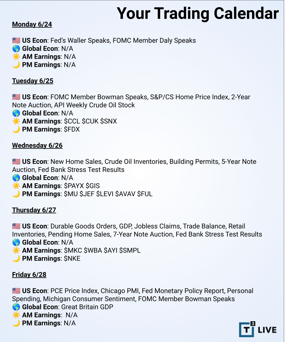 We have mixed markets around the world as we head into the last week of the second quarter. Europe is green while Asia is off small. Last Thursday, I warned that the semiconductors were overheated, and that proved a great spot to sell some winners. Some sophisticated traders made money shorting SMH, NVDA, AVGO, etc. as well as buying SOXS. It feels like we have a tactical top in that sector as we see if money rotates into the rebalance from last week.