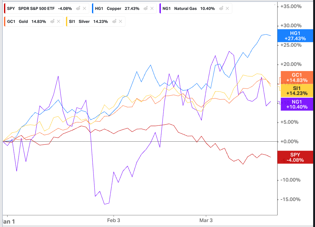 While the SPY is down 4% YTD, commodities have been skyrocketing, as you can see in the chart: