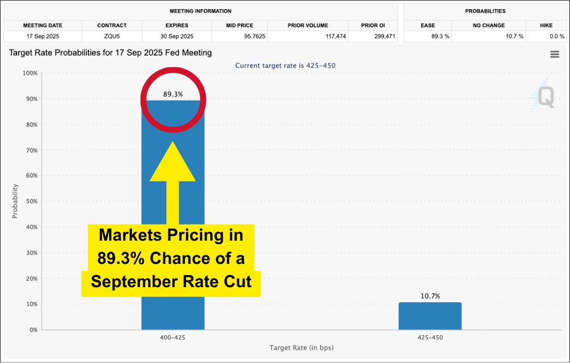 As of Friday afternoon, traders were pricing in an 89.3% probability of a September rate cut, according to the CME's FedWatch Tool.