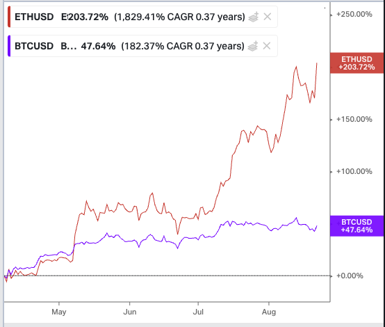 Ethereum was up 13% on Friday, and is now up over 200% from the April lows, crushing Bitcoin: