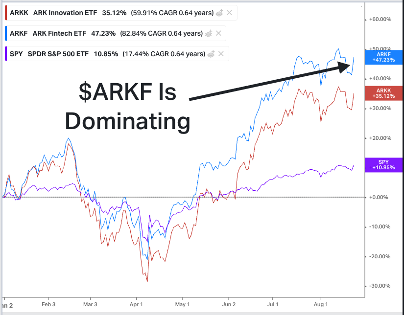 But she has an even bigger winner in the lesser-known Ark Fintech Innovation ETF (ARKF), which as you'd think, is levered even more heavily to booming fintech stocks like Robinhood (HOOD) and SoFI (SOFI).