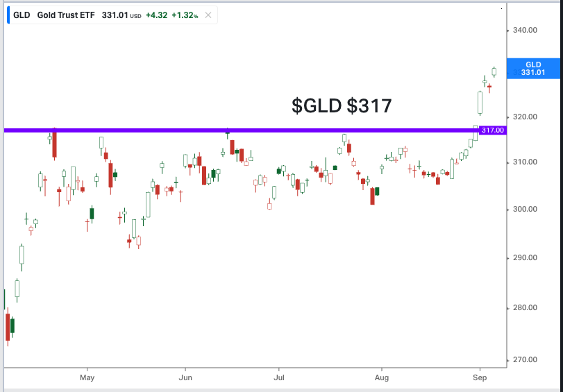 And on Monday, GLD cut through $317 resistance like a chainsaw through butter: