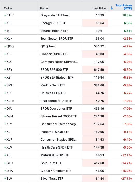 Our ETF monitor shows that everything is red for March, aside from Ethereum (ETHE), Bitcoin (IBIT), and Energy (XLE):