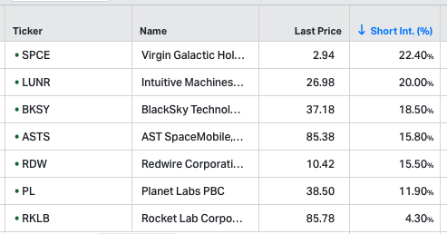 Interestingly, all these names aside from Rocket Lab (RKLB) are heavily shorted: