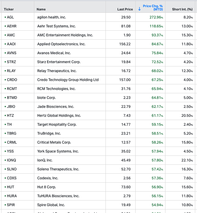 Like Aehr Test Systems (AEHR), which is up 118.6% this month on 13.0% short interest.